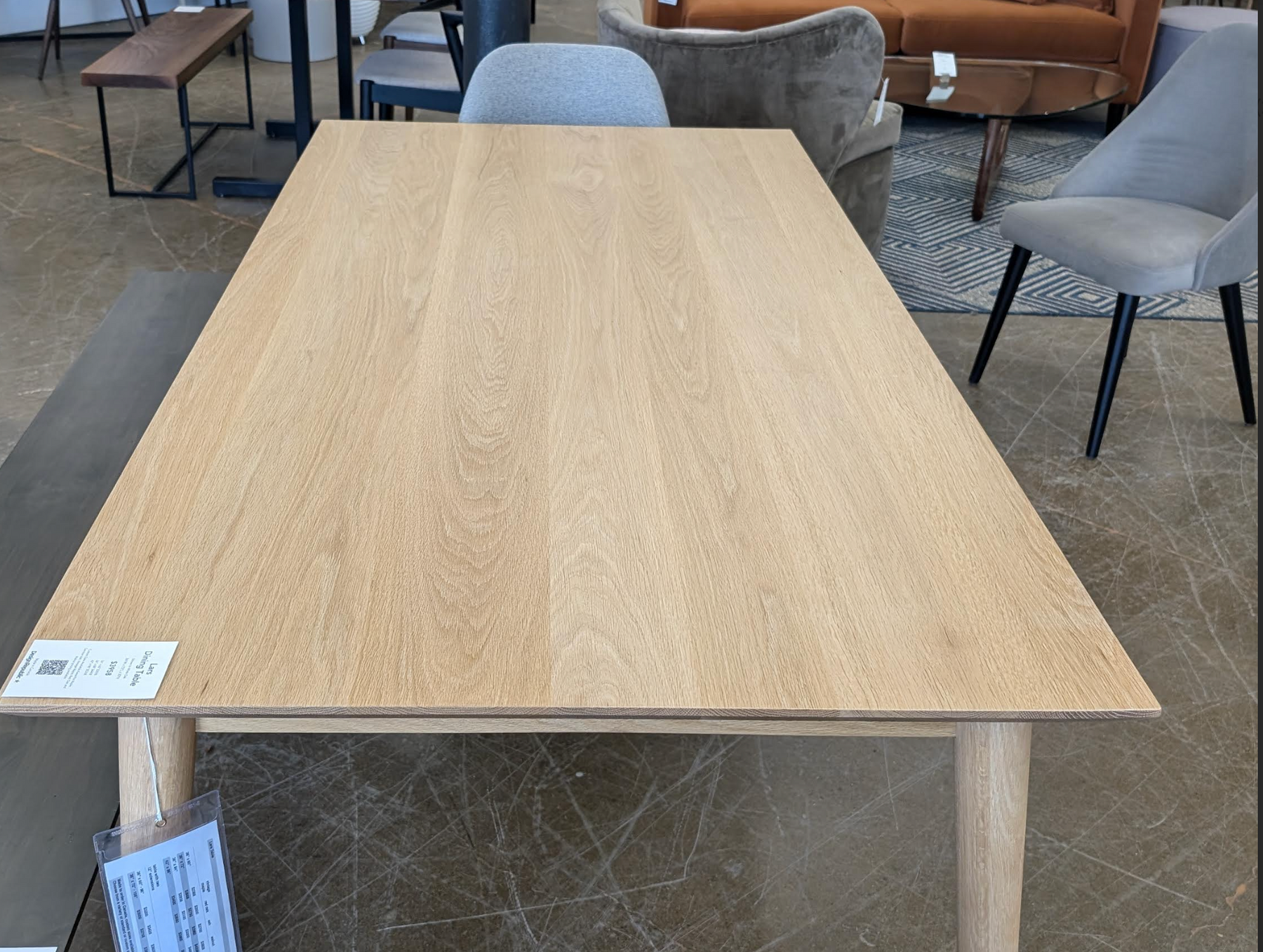 Crafted in Toronto from locally sourced white oak, the Lars Dining Table Floor Model is in amazing condition. The Lars dining table is completely made of gorgeous white oak, featuring a rectangular beveled edged tabletop on slightly tapered legs with aprons on the sides and ends. Enjoy your meals with your family and friends on this beautiful dining table.